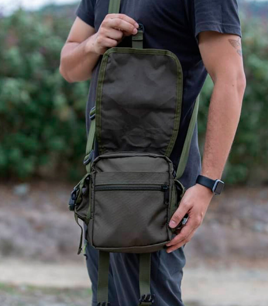 Viajero: tapa que cubre compartimento principal con bolsillo extra – Compartimento interno principal con cierre en cremallera para llevar tus elementos protegidos. – Dos bolsillos laterales con broches. – Bolsillo trasero secreto – Está confeccionado en poliéster semipermeable, facilitando su limpieza y secado rápido.